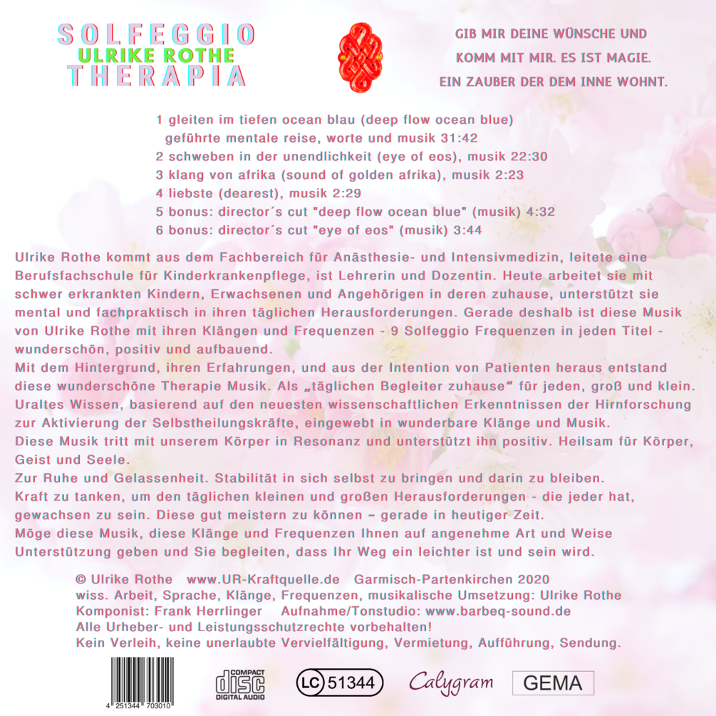 Uraltes Wissen, basierend auf den neuesten wissenschaftlichen Erkenntnissen der Hirnforschung zur Aktivierung der Selbstheilungskräfte. Heilende Frequenzen (Solfeggio) eingewebt in wunderbare Klänge und Musik. Inklusive einer geführten mentalen Reise im ersten Musiktitel in deutscher Sprache zur Einleitung in eine Meditation, in tiefe Entspannung. Die Worte und die Musik nehmen Sie mit auf eine wunderbare, wohltuende mentale Reise zur Aktivierung der mentalen Selbstheilung.